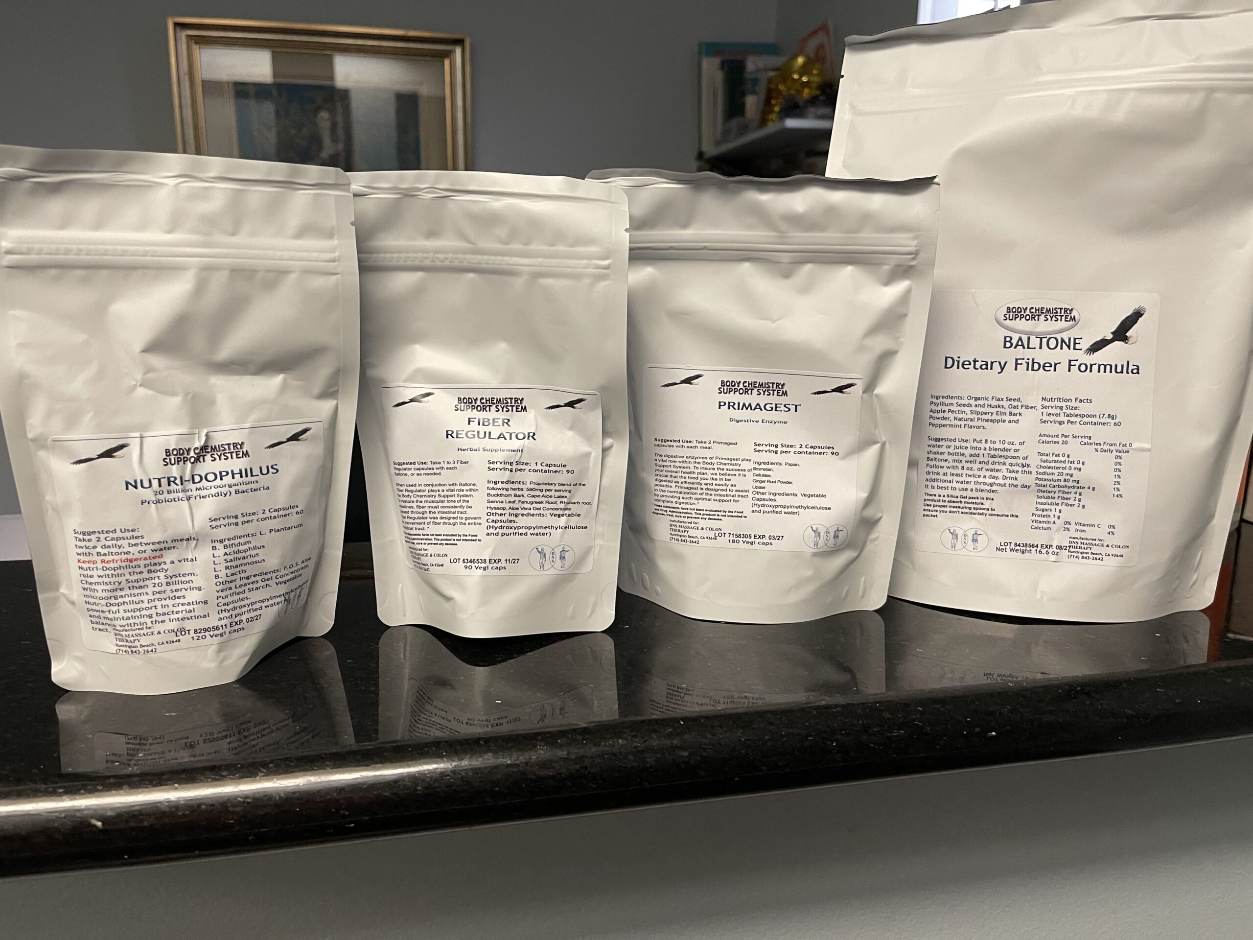 Primagest (1), Fiber Regulator (1), Nutri-Dophilus (1),and Baltone (powder) (1).